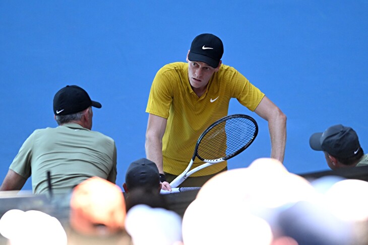"I když se budeš jen tak procházet, neboj se. Dáme si pauzu. Prostě musíme jít dál, do konce setu," nabádal ho kouč. Sinner byl napomenut za porušení času na servisu a také prohrával 1:3.