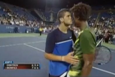 Dimitrov již nějakou dobu bydlí v Paříži a francouzi mají ve zvyku se po zápase přátelsky políbit. Monfils možná zapomněl, že Grigor už jejich manýry taky dávno převzal a nenastavil včas akorát tvář :))