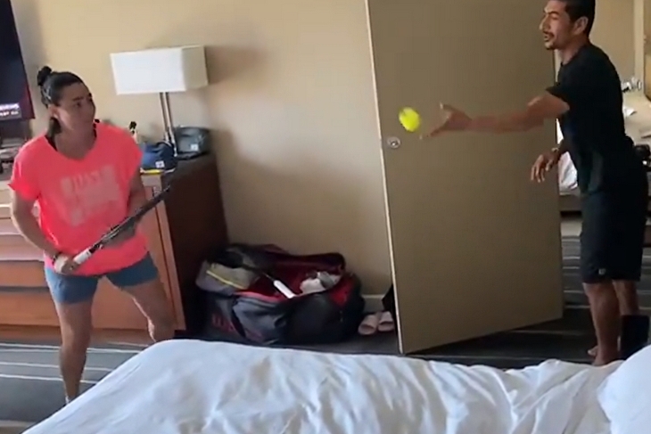 Když Rusky Darja Kasatkinová a Anastasija Pavljučenkovová nemohly trénovat na kurty, tak si daly 'výměnu' na pokojích.